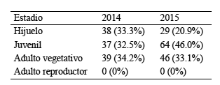 Dicha población consta de dos pequeños núcleos. El primero ocupa una superficie aproximada de 12 m2 (Fig. 3A), con un total de 34 rosetas en 2015 (30 en 2014). El segundo es de mayor tamaño, de unos 45 m2, con 105 rosetas en 2015 (84 en 2014) (Cuadro 1). La población parece, por tanto, estar en expansión, ya que presentó un incremento de 18% en el número de rosetas en apenas 10 meses. Los dos núcleos están separados por unos escasos 50 m. De los 139 elementos, la mayoría (93) podemos considerarlos como “juveniles” (aquellos con una roseta inferior a 0.7 m; Fig. 3B), y ninguno portaba estructuras reproductivas. De entre los últimos, hay 29 que midieron menos de 30 cm de altura y que probablemente hayan nacido en la presente temporada (los cuales, por tanto, podemos asimilar a la fase de “hijuelo”). De hecho, la comparación entre los censos por fenofases entre 2014 y 2015 indica que, mientras algunos elementos juveniles (7) habrían alcanzado el estadio de madurez, la mayoría de las rosetas que en 2014 estaban en el estadio de hijuelo ya habrían pasado a ser juveniles 10 meses más tarde (Cuadro 1).