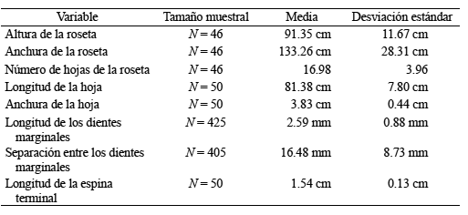 Las 46 rosetas adultas promediaron 91.4 cm de alto y 133.3 cm de ancho (Cuadro 2), dentro del intervalo descrito para la especie (véase más arriba). Sin embargo, algunas superaron ligeramente tales dimensiones (la de mayor porte, por ejemplo, era de 110 cm de altura por 180 cm de anchura) lo que puede atribuirse a que éstas crecen en un lugar parcialmente sombreado (Fig. 3D). Respecto a las hojas, promediaron 81.4 cm de largo por 3.8 cm de ancho (Cuadro 2), aunque en los individuos de mayor porte superaron 95 cm de longitud y alcanzaron 5 cm de anchura. Las rosetas adultas en general presentaron pocas hojas (17 de media por roseta; con un máximo de 29). Los dientes (Figs. 2 y 3C) por lo común fueron más cortos (2.6 mm de media, aunque en algunos individuos superaron los 5 mm) y ligeramente con menos separación entre ellos (16.5 mm) respecto al protólogo de la especie. La longitud de las espinas terminales sí se situó dentro de los valores esperados para Agave difformis (1.54 cm de promedio; Cuadro 2). En la población no hay restos de inflorescencias ni rosetas secas, lo que parece constatar su origen reciente. Es probable que las 139 rosetas contabilizadas provengan de muy pocas plantas madre, dado que la especie produce largos rizomas de los que emergen hijuelos de reproducción vegetativa (Fig. 3E).