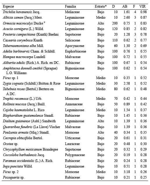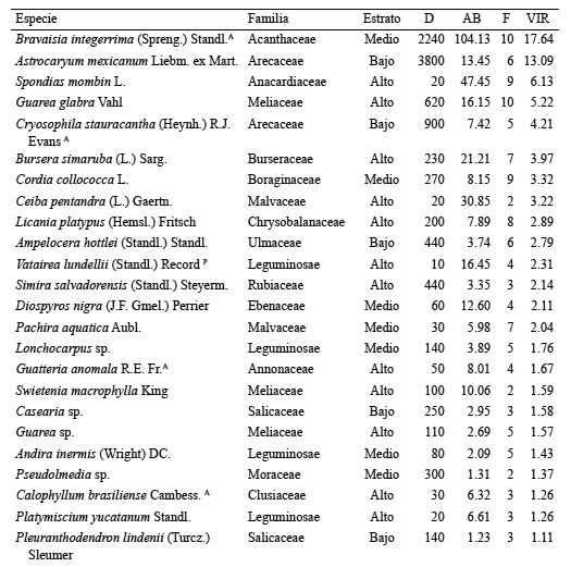 Las especies con mayor valor de importancia en la SMPC fueron Bravaisia integerrima, Spondias mombin, Cordia collococa y Astrocaryum mexicanum; mismas que también fueron reportadas con alto IVI por López-Mendoza (1980); Bongers et al. (1988) y Sol-Sánchez et al. (1999).