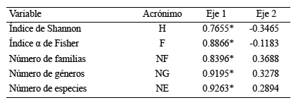 La riqueza a nivel de especie en YCAH fue de 53 especies y en PECH de 38, el promedio para los índices α de Fisher y de Margalef, así como el de Berger-Parker para evaluar dominancia resultaron ser mayores en YCAH, mientras que los índices de Shannon, de equidad de Pielou y Simpson fueron más altos en PECH (Cuadro 1).