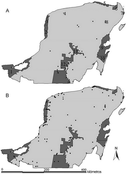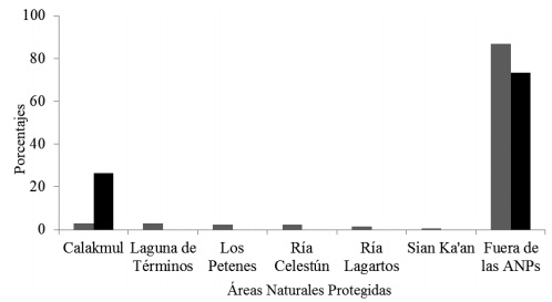Ambas especies están representadas en alguna de las ANPs existentes en la Península; no obstante, la mayor parte de los registros existentes fueron tomados fuera de éstas. Esto nos da una idea de que la mayor parte de sus poblaciones se encuentran sin protección alguna. Sin embargo, es necesario considerar que en este estudio solo se tuvieron en cuenta las ANPs federales y no se incluyeron las de tipo estatal, municipal y las privadas. De estas otras ANPs no se contaba con las coberturas que establecen sus límites y por ello no pudieron ser utilizadas en los análisis, aunque se tienen referencias de que en algunas existen extensos tintales, como es el caso de la Reserva Ecológica El Edén A.C. en Quintana Roo.