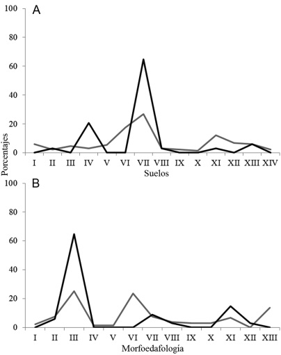 El mayor porcentaje de registros de H. calakmulense se encontraron en áreas donde predomina una combinación de suelos Leptosoles-Vertisoles (VII) (Fig. 2A). Estos suelos son generalmente de poco espesor, se desarrollan normalmente sobre roca dura o en áreas muy pedregosas y son de color oscuro con un alto contenido de arcilla. Haematoxylum campechianum se colectó en áreas con una mayor variedad de tipos de suelos (Fig. 2A), aunque los porcentajes más altos correspondieron de igual manera con suelos Leptosoles-Vertisoles (VII) y los de tipo Leptosol (VI) (Fig. 2A). De acuerdo a las características morfoedafológicas, H. calakmulense se colectó en su mayoría en sitios de tipo meseta kárstica denudatoriaerosiva (III) (Fig. 2B), al igual que H. campechianum; aunque esta última en una menor proporción y casi de igual forma se localizó en áreas del tipo planicie kárstica de selvas secas de Yucatán (VI) (Fig. 2B).