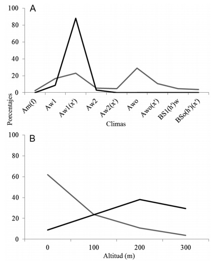 El clima predominante en los sitios de colecta de H. calakmulense fue Aw1(x’) (Fig. 3A), el cual se clasifica como cálido subhúmedo. Haematoxylum campechianum fue registrada en sitios con una mayor variación en relación al tipo de climas (Fig. 3A), siendo lo más representativo el Awo (cálido subhúmedo, con variación en las precipitaciones) y también el Aw1(x’) (Fig. 3A) como en el caso de H. calakmulense. En relación a la altitud, ambas especies se localizaron en sitios entre los 0 y 300 m s.n.m. (Fig. 3B). Haematoxylum calakmulense se localizó con mayor frecuencia entre los 200 y 300 m, mientras que H. campechia-num estuvo mejor representada al nivel del mar (Fig. 3B).