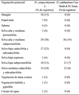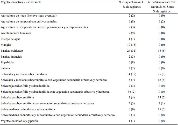 Con respecto a los sistemas ecológicos activos, el porcentaje más elevado de ejemplares de H. calakmulense fueron colectados en sitios donde se registró selva alta y mediana subperennifolia (Cuadro 1), aunque hay un porcentaje considerable que se tomó en sitios donde se registraron pastizales cultivados (Cuadro 1). Haematoxylum campechianum se colectó en localidades que mostraron una mayor variabilidad, siendo las áreas de pastizales cultivados las mejores representadas (Cuadro 1). Con respecto a los sistemas ecológicos potenciales, más de 50% de los registros de H. calakmulense son de sitios que debían estar potencialmente ocupados por selva alta y mediana subperennifolia (Cuadro 2); al igual que para H. campechianum, aunque en un porcentaje más bajo de alrededor de 30% (Cuadro 2).