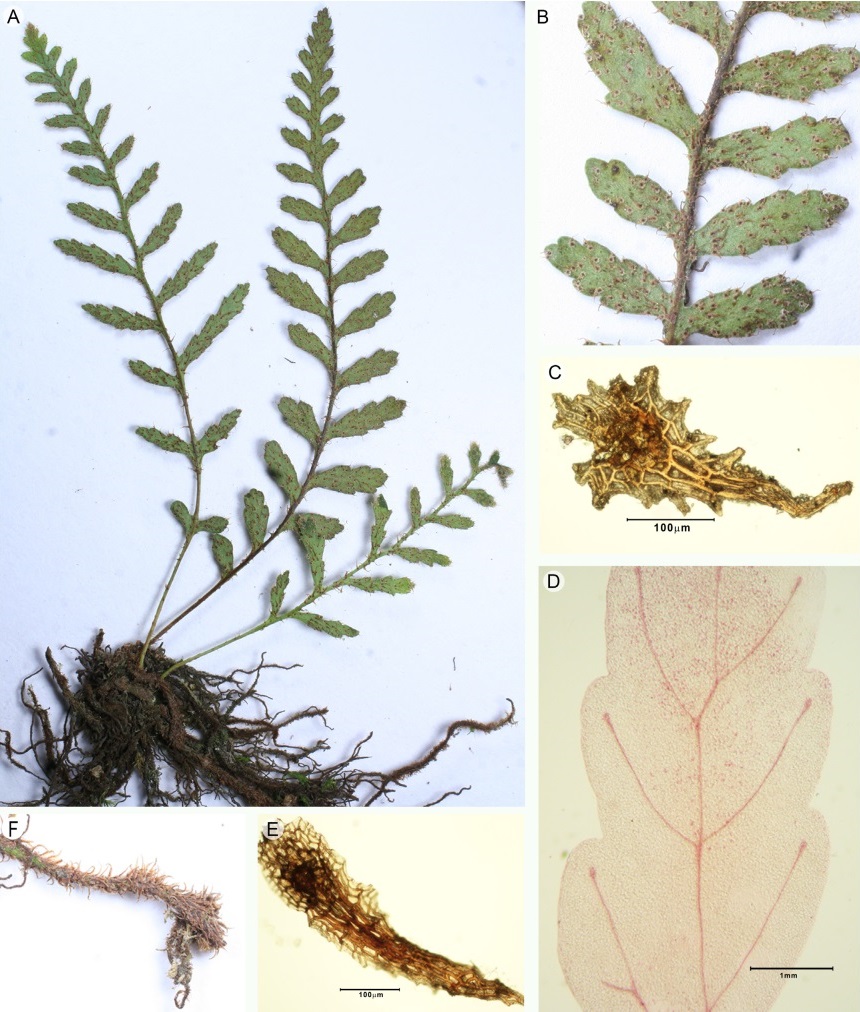 Rizoma largamente rastrero, 0.4-0.8 mm de diámetro; escamas del rizoma dimorfas, las del rizoma maduro 0.4-0.6 de largo, estrechamente ovadas, acuminadas, bicoloras, el punto de adhesión constituido de celdillas ocluidas negras, margen ancho, membranoso, pardo-amarillento, erosas en la base, márgenes con pequeños dientes, las del ápice del rizoma y base de las hojas 0.5-0.7 mm de largo, estrechamente lanceoladas, ápice atenuado, arqueadas a semierectas, bicoloras, con una franja central parda a pardo-oscuro de celdillas esclerosadas y semiocluidas, margen ancho, pardo-amarillento, inconspicuamente dentado, no comosas; hojas 2-8 cm de largo, distantes entre sí, (2-)7-15 mm; peciolo estrechamente alado, de 1/6-1/4 del largo de la hoja, 5-13 cm de largo, terete a cuadrangular, verdoso; lámina de contorno angostamente lanceolada a linear-lanceolada, de 1-6 × 0.4-1.5 cm, pinnada (o pinnatisectas, con segmentos unidos por las bases largamente decurrentes que forman un ala sobre el raquis 0.1-0.2 mm de ancho), gradualmente reducida hacia el ápice, pinnas estrechamente obovadas a lanceoladas, (1-)2-7 × (0.7-)1-2 mm, (3-)6-13 pares, distantes y alternadas o continuas y opuestas, sésiles con bases decurrentes, margen con (1-)2-5 pares de lobos o crenas, lobo apical agudo a redondeado, vena pajiza a parda (al menos basalmente), lustrosa, poco evidente hacia el ápice de la lámina, las secundarias no visibles; indumento de escamas esparcidas en ambas superficies (más densas en el envés), orbiculares a ovadas, con un ápice caudado a cirroso, 0.3-0.7 × 0.2-0.3 mm, con el centro pardo obscuro a negro y el margen hialino a pardo pálido, con el margen corto laciniado en el cuerpo y dentado en la cauda; soro no conocido pero un conjunto de escamas sorales o paráfisis presentes, ovado-peltadas, similar a las laminares.
