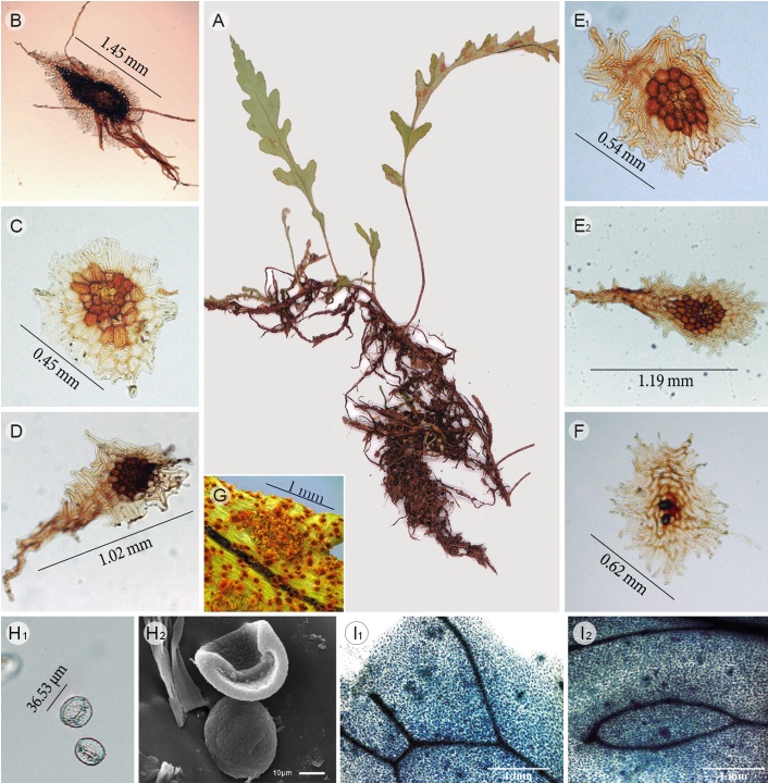 Rizoma largamente rastrero, 0.7-1 mm de diámetro; escamas del rizoma monomórficas, 0.8-1.5 mm de largo, ovado-apiculadas, bicoloras, al centro con una banda negra de celdillas subclatradas y margen ancho, membranoso, café pálido, con pequeños dientes a erosas, en el dorso del punto de inserción comosas en distintos grados de densidad y longitud; hojas 9-13 cm de largo, distantes a aproximadas; peciolo 1/4-1/5 del largo de la hoja, 2.5-4 cm de largo, terete, marrón; lámina lanceolada a oblan-ceolada, decurrente sobre el peciolo con las proyecciones alares estrechas que se desvanecen cerca de la base, 5-9.5 x 1.3-1.8 cm, lobado-pinnatífida hacia el ápice a pinnati-secta hacia la base con los lóbulos proximales distantes, vena media obscura, poco evidente hacia el ápice de la lámina, las secundarias no visibles; indumento de escamas esparcidas en el envés y glabrescente en el haz, escamas del envés mixtas, de orbiculares a ovado-apiculadas y caudadas, 0.4-1 mm de diámetro, con el centro café obscuro y margen café claro, fimbriado a ciliado; soro oblongo, con escamas sorales (paráfisis) peltados, orbiculares a ovado-lanceoladas, bicoloras, con centro obscuro y el margen café claro membranoso, margen fimbriado ciliado, 0.2-0.5 mm de diámetro; esporas monoletes, deformes, con verrugas en la superficie, 18-36 µm del diámetro mayor, 28-29 µm del menor en vista polar proximal.