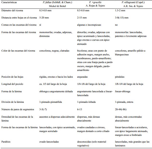 Comentarios: El espécimen descrito presenta caracteres intermedios que permiten dilucidar que uno de los progenitores es Pleopeltis fallax, el cual está caracterizado por presentar rizoma filamentoso con hojas pequeñas, lámina pinnada y pinnas pinatisectas, con las escamas laminares dispersas. Por las hojas lineares y el tipo de indumento en rizoma y hoja del híbrido se le puede emparentar con P. villagranii (Copel.) A.R. Sm. y Tejero (Cuadro 1). Este sería el primer híbrido entre Pleopeltis fallax y una especie del grupo de Pleopeltis furfuracea (Schltdl. & Cham.) A.R. Sm. (ambas de lámina dividida) en México. Sin embargo, en Costa Rica ya se conoce Pleopeltis ×pinnatisecta (Brade) A.R. Sm., un híbrido entre P. furfuracea y P. friedrichsthaliana (Kunze) A.R. Sm. y Tejero (Smith y Tejero-Díez, 2014).