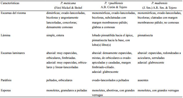 Comentarios: De los híbridos en Pleopeltis hasta ahora descritos para México (Mickel y Smith 2004; Smith y Tejero-Díez, 2014), Pleopeltis ×pueblensis es el único que presenta la lámina irregularmente pinnatisecta (a pinnada) en la base. Como varios de los híbridos encontrados en este género, las especies parentales son inciertas (Mickel y Beitel, 1987; Mickel y Smith, 2004) y hasta no probar con técnicas sofisticadas (una revisión de técnicas puede leerse en Barrington et al., 1989 y Chang et al., 2009), será imposible establecerlo con seguridad. Se podría especular que, por la lámina de contorno lanceolado, escamas del rizoma comosas y las de la lámina esparcida (sobre todo adaxialmente), con elementos dominantes orbiculares, uno de los progenitores podría ser Pleopeltis mexicana. La otra especie progenitora tendría que buscarse entre las especies de Pleopeltis pinatífidas, con escamas del rizoma de doble textura-color, sin escamas peciolares y muy pocas en la superficie adaxial de la lámina (estas escamas grandes y ovado-caudadas); tal vez alguna especie del grupo de Pleopeltis plebeia (Schltdl. & Cham.) A.R. Sm. & Tejero (Smith y Tejero-Díez, 2014). En el área donde se encontró P. ×pueblensis, se recolectó de este grupo a Pleopeltis madrensis (J. Sm.) A.R. Sm. & Tejero, que cumple con algunos de los requisitos señalados y, además, al igual que el híbrido encontrado, sus esporas presentan grandes verrugas en la superficie (Cuadro 2). Otra especie de Pleopeltis recolectada en la localidad es P. polylepis var. polylepis; sin embargo, presenta la superficie de la hoja (peciolo y porción abaxial de la lámina) densamente escamosa. Este sería el primer híbrido entre una especie de hoja simple y otra del grupo de P. plebeia (sensuSmith y Tejero-Díez, 2014).