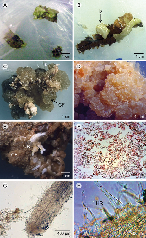 Two types of A. indica callus were successfully induced from the leaf explants. Non-embryogenic callus (NE) and rhizogenic callus (RC) in the leaf sections (Fig. 1) had a granular or gelatinous appearance with or without stimulation of organogenesis. Roots and shoots (St) were developed by indirect organogenesis as rhizogenic callus (RC). Similarly, non-embryogenic callus (NE) or friable callus (CF) were observed. These responses were influenced by the presence of BAP alone or combined. The calli were induced from leaf sections of leaflets sections (at 10 days into the culture) and large necrotic cells were developed in the greenish bulging section (Fig. 1A, B), demonstrating initially a yellowish-white, granular or friable (CF) light-gelatinous texture (Fig. 1C). In the elapsed time, the callus became necrotic (Fig. 1D) or differentiated in roots (Fig. 1E). The callus presented loosely distributed, small, irregularly shaped cells and poor cytoplasm (Fig. 1F), whereas the differentiated roots consisted of vascular tissue with xylem vessels of reticular thickenings (Fig. 1G) and abundant root hairs (Fig. 1H).
