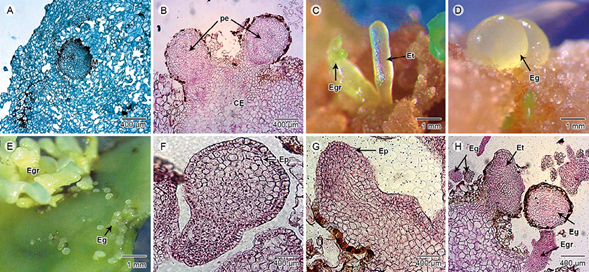 The primary somatic embryos showed a smooth and shiny surface, with yellow-green color after 15-30 days culture. Subsequently, a large amount of embryos were observed, principally in the globular-shape stage. Embryogenic cultures derived from embryogenic callus displayed different types of cells, either isolated or forming an aggregate in different stages such as torpedo (Fig. 2C), globular (Fig. 2D) or seedling germination stage (Fig. 2E). Similarly, some secondary embryos were distinguished at this phase. The somatic embryos were renewed in isolated form (Fig. 2F) or attached to the pro-embryogenic mass (Fig. 2G), because of the presence of the connection in the parent tissue through the suspender (Fig. 2H), which evidences the origin of the embryo.