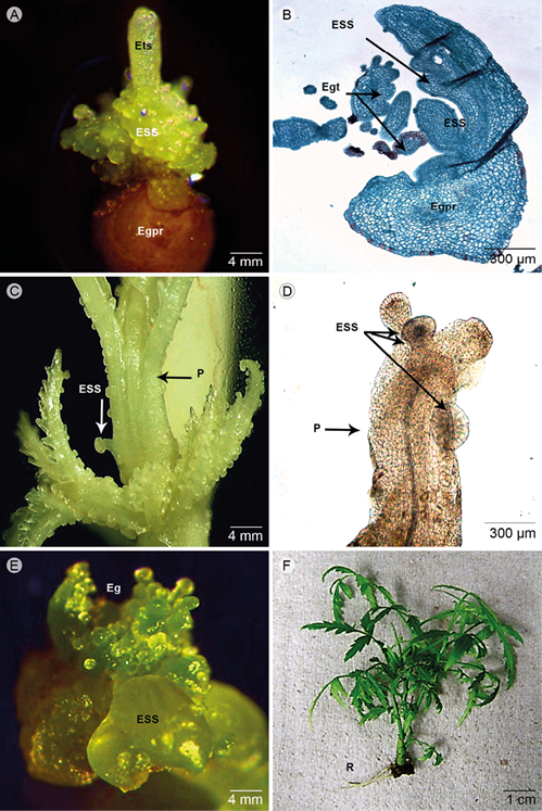 The ESS were observed directly at diverse phases of development. The formation of secondary somatic embryos developed directly by cell division at the epidermal and sub-epidermal levels in the primary embryos (Fig. 3A) or the regenerated organ as shoot (Fig. 3B). Additionally, during the regeneration process the ESS were differentiated directly in the hypocotilar zone (epidermal surface) of the primary somatic embryos, both non-germinated and germinated (Fig. 3C). Germinated embryos were distinguished by the observation of the elongated cells at the base of embryos and the presence of lignin in the wall in which lignin is characteristic of the development of vascular tissue. Some somatic embryos were developed in the primordia of the regenerated callus (Fig. 3D). Repetitively, the embryos continued to develop up to 8 weeks (4 or more cycles) as shown in Fig. 3E. This was related to the incubation period, the embryogenic response increased as the incubation time was increasing. The frequency of secondary embryos per primary somatic embryo in every cycle was 14 (±1). After 5-6 weeks, the somatic embryos could be differentiated and subsequently the plants developed the leaves and shoot. Consequently, the vitro plants were changed to MS1/2 for rooting, as shown in Fig. 3F (plants after 16 weeks). Then the plantlets were acclimated in vermiculate at 16 h light/8 h dark at 28 °C as photoperiod with 60% moisture.