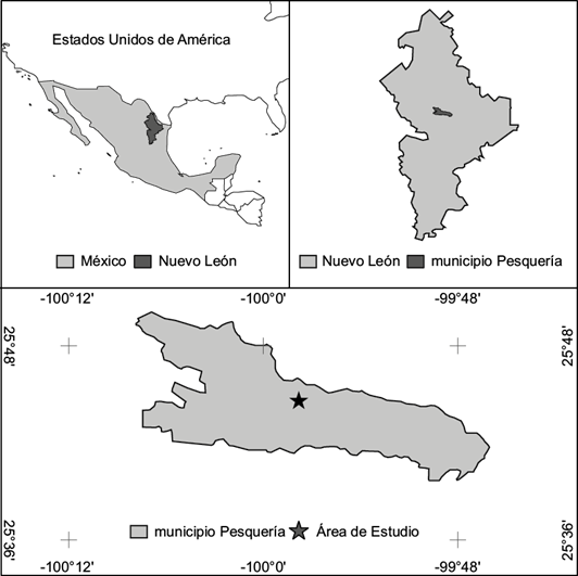 El estudio se desarrolló en el Área de Conservación de Flora y Fauna Silvestre del Complejo Siderúrgico Ternium, en el municipio Pesquería, Nuevo León (Noreste de México), entre las coordenadas 25°44'32.17"N, y 99°57'45.23"W, con una altitud de 304 m (Fig. 1).