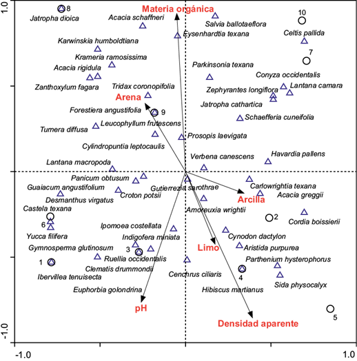 Métodos: En 2014 se establecieron 10 sitios de muestreo en dos ambientes diferenciados por la estructura de la vegetación: cinco sitios en asociaciones vegetales con cobertura vegetal densa y cinco sitios en áreas perturbadas con suelo desnudo. En cada área se evaluó la estructura vegetal y variables edáficas y se realizó un Análisis de Correspondencia Canónica.