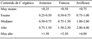 Se obtuvo a través del método “combustión húmeda y titulación según Walkley/Black modificado”, que consiste en la oxidación del carbono orgánico que contiene el suelo con un exceso de dicromato de potasio en un medio fuertemente ácido, valorando el exceso de dicromato con sulfato ferroso (Walkley y Black, 1934).