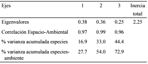 Al incluir variables bióticas y abióticas en el análisis, mediante CANOCO (Análisis de Correspondencia Canónica, de gradiente directo) se observó que la inercia total de los datos (total inertia=2.25) es estadísticamente heterogénea y pueden analizarse para obtener resultados referentes a la preferencia de hábitat de las especies analizadas, en especial la especie de estudio Amoreuxia wrightii por determinado tipo de hábitat. Los tres primeros ejes engloban 0.38, 0.36 y 0.25 de la varianza total de los datos y las correlaciones fueron bastante altas, 0.97, 0.99 y 0.96, lo que demuestra la relación estrecha entre vegetación y variables ambientales (Cuadro 3).
