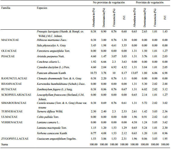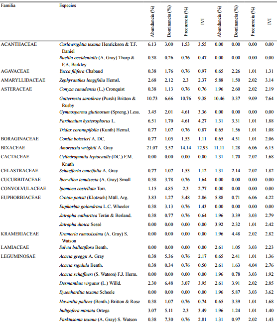 En el área provista de vegetación la especie más abundante resultó ser Panicum obtusum (13.07%); con mayor cobertura relativa fueron las arbustivas Zanthoxylum fagara (L.) Sarg. (6.02%), Eysenhardtia texana (5.87%), Castela texana (Torr. & A. Gray) Rose var. texana (5.72%), Karwinskia humboldtiana (Schult.) Zucc. (5.30%) y Lantana macropoda Torr. (5.24%); la de mayor frecuencia relativa (9.09%) e índice de valor de importancia (7.64%) fue Gutierrezia sarothrae.