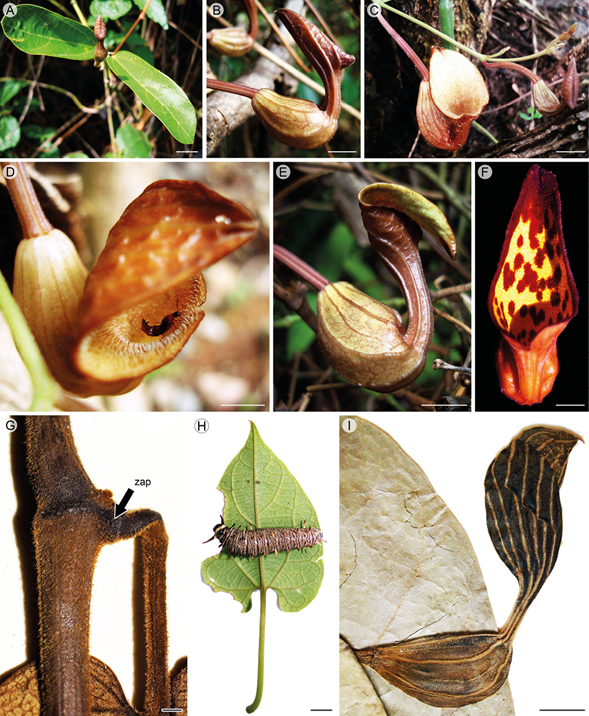 1b. Bejucos o lianas; peciolo usualmente ≥2 cm de largo (en A. maxima y A. tonduzii O.C. Schmidt a veces <2 cm); lámina foliar desde ovado-angosta a reniforme, con base cordiforme, envés color verde claro, rara vez color grisáceo, y venación palmeada; flores solitarias, axilares, o dispuestas en cimas >5 cm de largo o en racimos caulifloros o ramifloros, cortos (<5 cm de largo), usualmente con ≥4 flores cada uno; limbo del perianto uni- o bilabiado, nunca buliforme, el labio principal dirigido hacia arriba, excepto en A. grandiflora, en donde está dirigido hacia abajo y se prolonga en una cauda hasta 1 m de largo; ginostemo 6-lobado; cápsula con dehiscencia acrópeta (excepcionalmente basípeta en A. grandiflora y A. pilosa); semillas <1 mm de grosor (desconocidas en A. cruenta Barringer) ... 2 Aristolochia subg. Aristolochia
