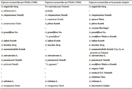 La revisión taxonómica más completa de las especies de Aristolochia presentes en Panamá fue realizada por Pfeifer (1960), quien reportó 13 especies. El mismo autor (Pfeifer, 1966) redujo a 12 el número de especies y efectuó varias modificaciones taxonómicas con respecto a su trabajo previo (Cuadro 1). Más recientemente, Barringer (1983) propuso una nueva especie restringida a Panamá, A. pfeiferi Barringer.