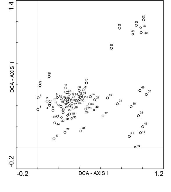 We graphically presented axis I (eigenvalue of 0.085 and a cumulative percentage of variance of 29.2%) and axis II (eigenvalue of 0.051 and a cumulative percentage of variance of 46.6%) of the DCA. The ordination diagram shows that the specimens analyzed are positively correlated with axis I (Figure 1), most samples of Senegalia saltilloensis and S. roemeriana are mixed and placed close to the center of the ordination diagram. The group located at the extreme of both axes indicates morphological variation proper of the species. Some of the numbers at the upper right (19, 49, 59, 47, 48, 39, 46) are specimens without fruits and the ones on the right (68, 57, 38, 25, 43, 41, 16, 33) have no flowers.