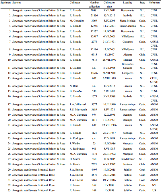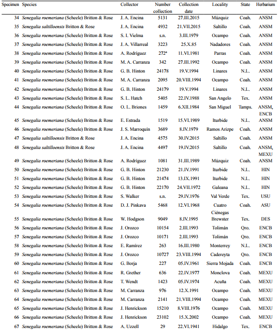 A total of 62 samples of Senegalia roemeriana from the herbaria ANSM, ASU, CFNL, DES, ENCB, HIN, MEXU, and USU were examined (Thiers, continuously updated) (Table 1). These collections are a good representation of this species. In addition, eight samples from the Saltillo area, including the annotated “type” material of Senegalia saltilloensis were included (ANSM, NY, US). The revision of the herbarium specimens had the purpose of comparing and analyzing the morphological variation of the two related taxa. A series of selected characters that can be evaluated from herbarium samples were taken from each specimen.