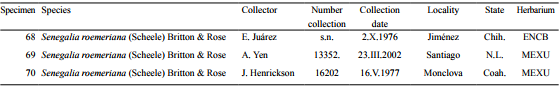 The results support the synonymy published by Seigler et al. (2006b), considering the names Senegalia saltilloensis and the combination Acacia saltilloensis published by Rico-Arce (2007) as synonyms of the previous name Senegalia roemeriana.