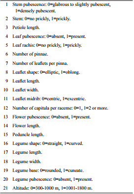 A total of 70 samples were evaluated as representative of the morphological diversity of both species and Senegalia saltilloensis and S. roemeriana were considered as OTUs (Operational Taxonomic Units). A number of 21 characters were selected as elements of informative value (Table 2). A stereomicroscope Labomed model CSM2 (U.S.A.) and a vernier Mitutoyo series 1505 (Japan) were used to observe details and take measurements. The data were analyzed by the Detrended Correspondence Analysis (DCA), using the CANOCO version 4.5 software (ter-Braak and Šmilauer, 2002).