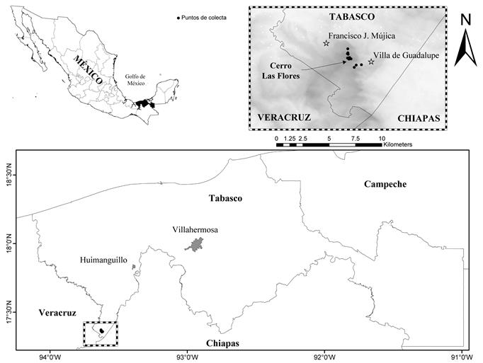 El estado de Tabasco se localiza al sureste de México en la costa del Golfo de México y presenta un relieve plano en la mayor parte de su territorio. Pequeñas porciones al sur están cubiertas por sierras que alcanzan altitudes de 500 a 1000 m en las zonas limítrofes con los estados de Veracruz y Chiapas, así como en la frontera con Guatemala (Díaz-Jiménez et al., 2015). El muestreo fue realizado en la cara norte y noreste de la localidad conocida como cerro Las Flores, perteneciente al ejido Villa Guadalupe (región Agua Selva), en el municipio Huimanguillo, cerca de las colindancias con los estados de Chiapas y Veracruz (Fig. 1). La zona de estudio contiene en su superficie un fragmento de bosque mesófilo de montaña en buen estado de conservación que ocupa una franja de cerca de 300 m de altitud, ya que se distribuye desde los 700 hasta los 1000 m s.n.m., abarcando una superficie aproximada de 0.9 km2. En un rango altitudinal de 500 a 700 m, se encuentra representada una zona de transición entre la selva mediana subperennifolia y bosque mesófilo de montaña. Por debajo de 500 m, cercano a las comunidades Francisco Mújica y Villa de Guadalupe, predominan fragmentos de selva mediana subperennifolia rodeados de fracciones de terreno ocupadas por vegetación secundaria.