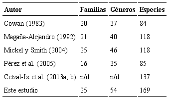 La investigación florística previa demuestra que los estados con mayor diversidad de helechos y licopodios en México son Chiapas (697 especies), Oaxaca (667) y Veracruz (564) (Mickel y Smith, 2004; Krömer et al., 2015). Sin embargo, aún quedan estados o regiones que requieren de estudios más detallados. Un ejemplo de ello lo representa el estado de Tabasco, en el cual se han realizado pocos estudios que documenten la riqueza de especies de helechos y licopodios. De los trabajos que tratan estos grupos de plantas, el de Cowan (1983) reporta 84 especies y Magaña-Alejandro (1992) registra la presencia de 118. La misma cantidad es mencionada por Mickel y Smith (2004), aunque con especies distintas; incluso los autores no incluyen algunos taxa que sí son considerados por Magaña-Alejandro (1992), por no haber sido verificados. Por otro lado, Pérez et al. (2005), basados en un estudio de campo focalizado en zonas específicas del estado, reportan únicamente 85 especies en el apartado de flora de la obra Biodiversidad de Tabasco (Cuadro 1).