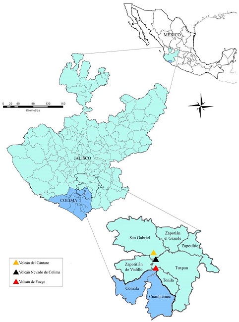 El Complejo Volcánico de Colima (CVC) forma parte del Eje Volcánico Transversal Mexicano (Fig. 1), se localiza entre los estados de Jalisco y Colima, en las coordenadas geográficas 19°40'45"N, 103°49'16"O y 19°22'48"N, 103°25'32"O, con una superficie total de 843.13 km2 (Magaña-Martínez y Palacios-Vargas, 2010; Segura-Trujillo y Navarro-Pérez, 2010). Dicho complejo está constituido por tres cumbres volcánicas: el Nevado de Colima (4270 m s.n.m.), el Volcán de Fuego (3860 m s.n.m.) y el Volcán del Cántaro (2900 m s.n.m.) (SEMARNAT-CONANP, 2007). El CVC comprende seis municipios del estado de Jalisco: San Gabriel (Venustiano Carranza), Tonila, Tuxpan, Zapotiltic, Zapotitlán de Vadillo y Zapotlán el Grande (Ciudad Guzmán) y dos del estado de Colima: Comala y Cuauhtémoc (SEMARNAT-CONANP, 2007).