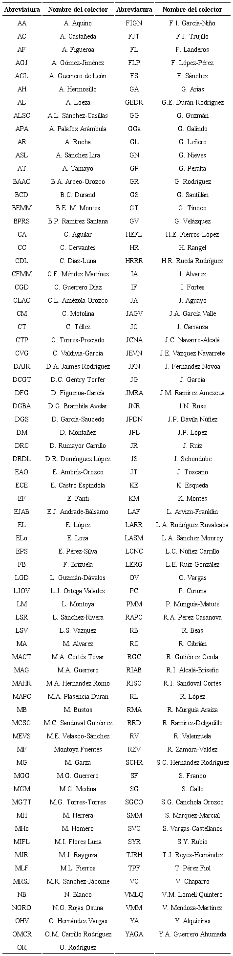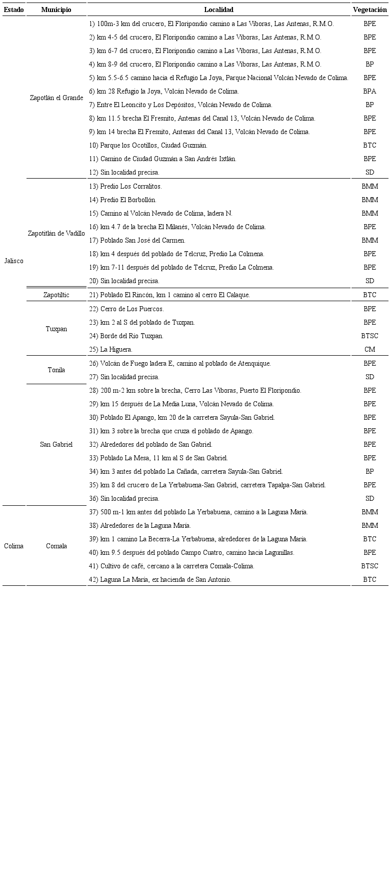 En dicho listado, además de las especies estudiadas y corroboradas en este trabajo, se incluyen los taxones citados en la bibliografía y en el que la mayoría de los casos no se cuentan con el ejemplar y/o datos completos (o precisos) del material. La información sobre el uso de los hongos se obtuvo de la consulta bibliográfica de diversas obras (Guzmán, 1994, 2004, 2008; Hall et al., 2003; Pérez-Moreno et al., 2008; Shepard et al., 2008; Bautista-González y Moreno-Fuentes, 2014; Garibay-Orijel y Ruan-Soto, 2014). Se aporta la lista de colectores con su respectiva abreviatura (Apéndice 2) con un total de 136 registrados. Se incluye un listado de localidades de los municipios de ambos estados, Jalisco y Colima, que comprenden el CVC (Cuadro 1).
