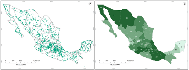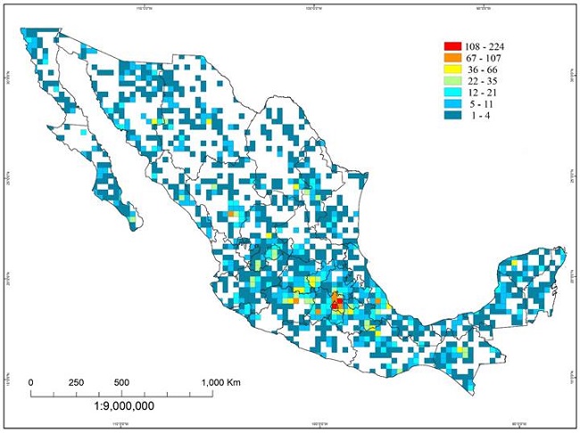 El territorio de México se dividió en una reticula compuesta de celdas, 1179 tuvieron al menos un registro (Fig. 6). El número de sitios por celda varió de 1 a 224. Se encontraron casos de una celda con 224 sitios, 183, 107 y 101 sitios, 64 celdas de 95 a 20 registros, siete celdas con 19, seis celdas con 18, 11 celdas con 17, siete con 16, 12 con 15, 15 con 14, 18 con 13, nueve con 12, 14 con 11, 17 con 10, 27 con nueve, 41 con ocho, 43 con siete, 52 con seis, 71 con cinco, 119 con cuatro, 129 con tres, 185 con dos y 326 celdas con un solo sitio. El área con mayor densidad de sitios se localizó en el centro del país, entre el Estado de México y la Ciudad de México, así como en el centro de Durango, centro de Veracruz y norte de Michoacán (Fig. 6).