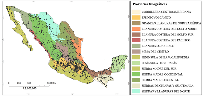 INEGI. 2001. Conjunto de datos vectoriales Fisiográficos. Continuo Nacional serie I. Provincias fisiográficas. Escala 1:1, 000,000. https://www.inegi.org.mx/app/mapas/default.html?t=0150007000000000&ag=00 (consultado enero de 2019).