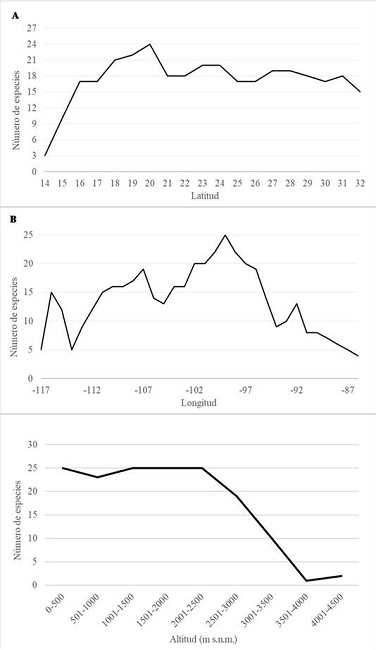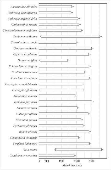 Las plantas silvestres hospedantes de X. fastidiosa subsp. fastidiosa crecen en un gradiente de 0 a 4146 m de altitud (Fig. 3C), y entre 14° a 32° de latitud norte (Fig. 3A) y 87° a 117° longitud oeste (Fig. 3B). De las 26 especies registradas, 23 se encontraron entre 0 a 3500 m s.n.m., y solo tres entre 3500 y 4146 m s.n.m. (Fig. 3C). Conium maculatum L. fue la especie con mayor amplitud altitudinal (155-4031 m s.n.m.) y está presente en 11 estados. Caso contrario, Datura wrightii presentó la amplitud altitudinal más restringida (83-1899 m s.n.m.) y Vicia sativa L. se encontró por arriba de 1099 m s.n.m. (Fig. 5).