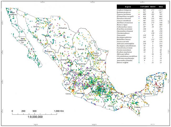 Se elaboró una base de datos de las especies hospedantes de X. fastidiosa subsp. fastidiosa reportadas por la EFSA (2018), con los siguientes tres tipos de información: 1) referencias bibliográficas (Villaseñor y Espinosa-García, 1998, 2004; Rzedowski y Rzedowski, 2004; Júarez-Jaimes et al., 2008; Vibrans, 2009, 2012; Vargas-Ponce et al., 2017); 2) ejemplares de herbarios depositados en colecciones biológicas, Herbario Nacional de México (MEXU) (UNAM, 2019); y 3) ejemplares del Sistema Nacional de Información sobre Biodiversidad (SNIB, 2019) (museos, colectas y proyectos).