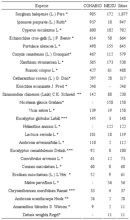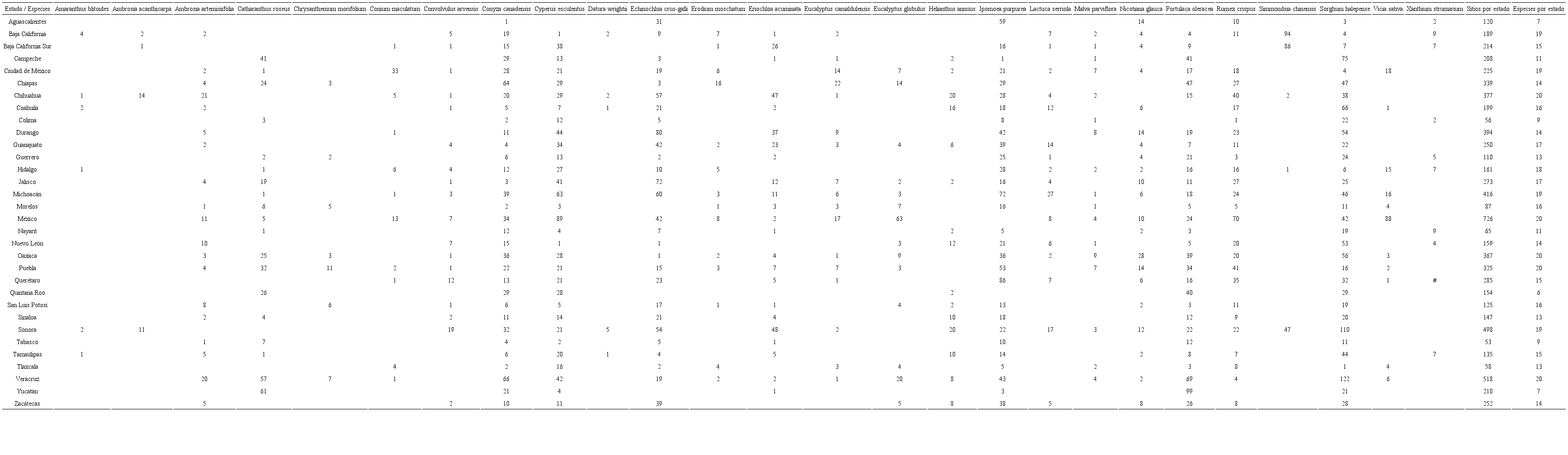 Las 26 especies vegetales reportadas como hospedantes de X. fastidiosa subsp. fastidiosa reportadas por la EFSA (2018) tuvieron presencia en los 32 estados de México (Cuadros 1, 2). Su distribución geográfica fue irregular. En Chihuahua, Estado de México, Oaxaca, Puebla y Veracruz se concentró el mayor número de especies (Cuadro 2, Fig. 1B), mientras que Quintana Roo, Aguascalientes y Yucatán presentaron el menor número de especies. El Estado de México, Veracruz, Sonora, Michoacán, Durango, Chihuahua, Oaxaca, Chiapas, Puebla, Baja California Sur, y Ciudad de México tuvieron más sitios con presencia de hospedantes, que en conjunto corresponden con 52% de los registros. Sorghum halepense (L.) Pers., Ipomoea purpurea (L.) Lam., Cyperus esculentus L. y Echinochloa crus-galli (L.) P. Beauv. fueron las especies con mayor distribución, pues estuvieron presentes en 1077 sitios y 32 estados, 947 (30), 702 (31) y 664 (28), respectivamente. Por el contrario, Ambrosia acanthicarpa Hook., Datura wrightii Regel, Simmondsia chinensi (Link) C.K. Schneid. y Amaranthus blitoides S. Watson se encontraron en menos de seis estados (Cuadro 2, Fig. 2).