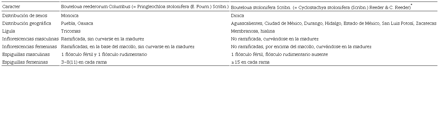 Conclusiones: Bouteloua reederorum es distinta de Bouteloua stolonifera (= Cyclostachya stolonifera). Es necesario realizar estudios fenológicos para determinar si B. reedeorum puede ser dioica.