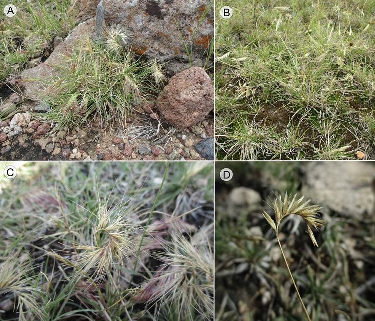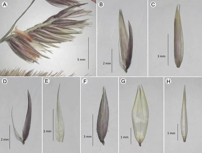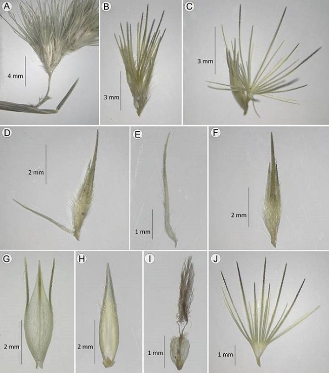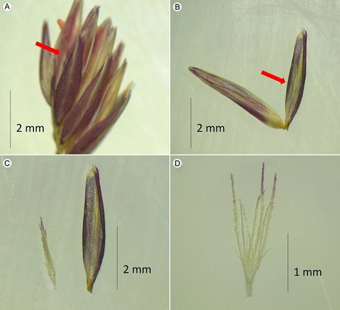 Notas taxonómicas: aunque se describen las espiguillas masculinas de B. reederorum como desprovistas de flósculos rudimentarios, se observó la presencia de estas estructuras en espiguillas de las ramas apicales en un par de ejemplares (Fig. 5). En ambos casos, el flósculo que debería ser fértil, con lema y pálea bien desarrolladas, carecía de estambres. Los flósculos rudimentarios observados en estas espiguillas son flabeliformes y con múltiples aristas (Figs. 5C, D), como sucede en las espiguillas femeninas, pero de menor tamaño, ≤2 mm de largo.