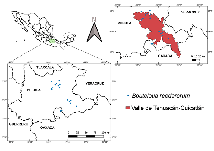 Aun cuando existen registros de que B. reederorum se distribuye exclusivamente en los estados de Puebla y Oaxaca (Scribner, 1896; Columbus et al., 1998; Beetle et al., 1999; Espejo-Serna y López-Ferrari, 2000), se ha reportado también para Aguascalientes, Durango, San Luis Potosí y Zacatecas (Herrera-Arrieta et al., 2010; Herrera-Arrieta, 2014; Villaseñor, 2016; Sánchez-Ken, 2019). Es probable que lo anterior se deba a que Cyclostachya stolonifera (Scribn.) Reeder & C. Reeder ha sido considerado erróneamente como un sinónimo de B. reederorum (Herrera-Arrieta et al., 2010; Peterson et al., 2001), cuando en realidad C. stolonifera es sinónimo de B. stolonifera Scribn. (Columbus, 1999), la cual es dioica y se distribuye en el norte del país. Debido a la confusión existente entre estos dos taxones, los ejemplares de B. stolonifera son identificados como B. reederorum, lo que genera falsos reportes de esta última en sitios en los que en realidad no se encuentra.