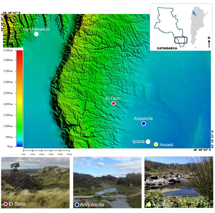 La Sierra de Ancasti se localiza en el departamento de Ancasti, el área de estudio incluye las localidades rurales de Anquincila, El Taco, Ipizca y Villa de Ancasti, poblaciones ubicadas al extremo sureste de la provincia de Catamarca, Argentina (Fig. 1). A su vez, la región estudiada se ubica en la provincia biogeográfica del Chaco Seco (distrito Chaco-Serrano) y hace parte del sistema de sierras pampeanas que superan los 1200 m de altitud. La región se caracteriza por presentar un clima cálido-húmedo, con una temperatura media anual de 19 °C y precipitaciones que oscilan entre los 500 y 1200 mm anuales concentradas hacia la época de verano (Bazán, 2006; Palmeri et al., 2008). Los pobladores rurales de la región se autodefinen como “criollos-serranos” y mantienen una clara vocación campesina (Jiménez-Escobar, 2019). La economía actual es de subsistencia, se asocia principalmente a la producción ganadera (caprina, ovina y vacuna) en sistemas poco tecnificados y a campo abierto (Bazán, 2006). Según los datos más recientes del Instituto Nacional de Estadísticas y Censos (INDEC), el departamento de Ancasti para el año 2010 presentaba una población de 2900 habitantes que conforman un total de 786 hogares o unidades familiares en las que cerca de 45% de ellas dependen de la leña para cocinar (INDEC, 2010).
