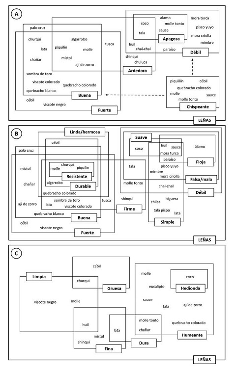 A partir de las especies de leña mencionadas (todas asociadas a un nombre común), se vincularon 25 términos vernáculos con los cuales se elaboró una gráfica que condensa las principales clasificaciones locales (Fig. 2). Esta representación debe entenderse como un esquema idealizado, dinámico y cambiante en el tiempo, que además depende de un sin número de variables ambientales, climáticas, ecológicas, sociales, entre otras.