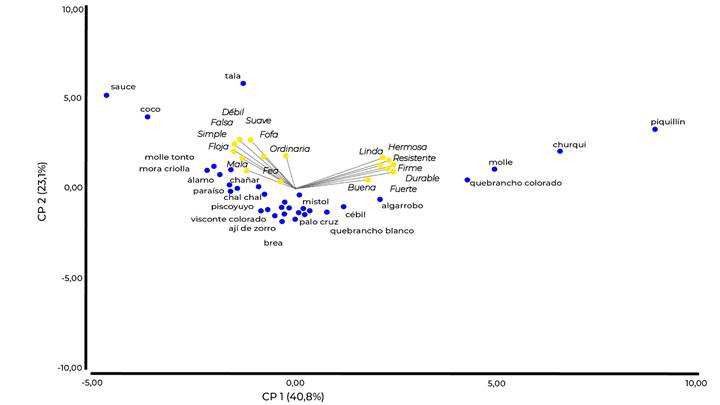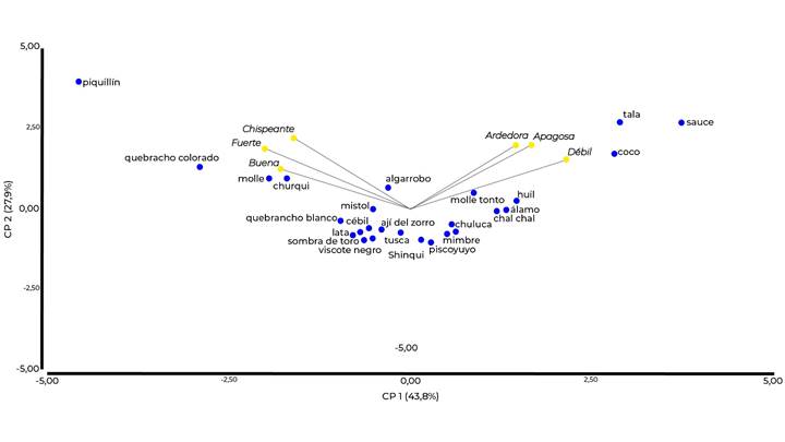 Algunas de las propiedades que constantemente son destacadas por los pobladores son aquellas relacionadas con la facilidad de encender, la capacidad de arder y la de generar llama. En esta clasificación, los términos “débil” y su contrario “fuerte” son aquellas características que representan el mayor poder explicativo, siendo categorías opuestas y contrastantes (Fig. 3). El ACP con relación a los términos vernáculos y las especies arrojó como resultado una variabilidad del 72% entre los dos ejes.