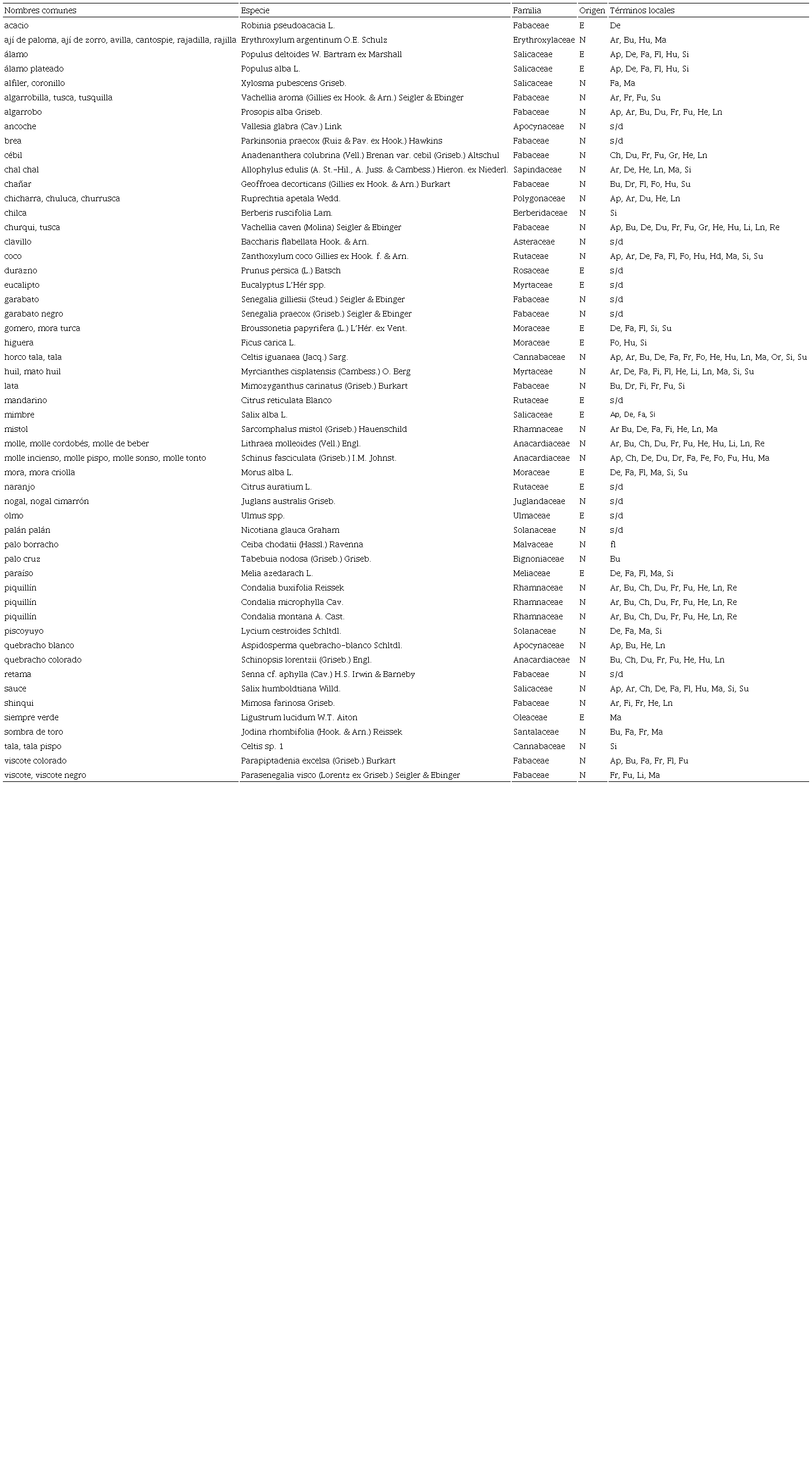 Se registraron 53 especies de leña asociadas a 74 nombres comunes (Cuadro 1). Las plantas mencionadas corresponden a 45 géneros y 23 familias botánicas. La familia Fabaceae sensu lato presentó el mayor número de especies (14), seguida de Salicaceae (cinco) y Rhamnaceae (cuatro). En cuanto al origen biogeográfico, 39 especies (74%) son nativas; destacan Berberis ruscifolia Lam. y Myrcianthes cisplatensis (Cambess.) O. Berg, consideradas endémicas del Cono Sur (Zuloaga et al., 2008); las 14 restantes son exóticas (26%).