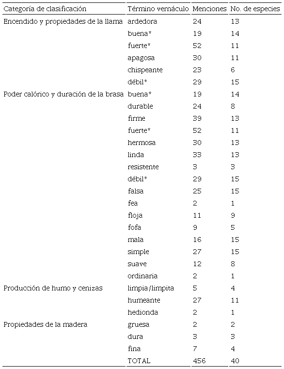 Por medio de la técnica “juego de palabras” se recopiló, para las categorías de clasificación, un total de 25 términos vernáculos o categorizaciones locales, asociados a 40 de las 53 especies de leña mencionadas (Cuadro 2). Los términos se relacionaron directamente con cualidades o propiedades intrínsecas de los recursos dendroenergéticos. Los siguientes fragmentos de discurso ilustran la manera en que los pobladores describen una leña. Utilizan las siguientes palabras que realzan atributos, señalan cualidades o definen propiedades -positivas o negativas- de las especies: “las mejores leñas son las más firmes… algarrobo, piquillín, churqui y molle; las débiles pueden servir para brasa como el sauce, el chal chal, la mora…” (C.P., 68 años), “el cébil es muy fuerte para el asado” (R.O. 91 años), “el palo de borracho no me gusta, es una leña muy floja” (A.B., 64 años).
