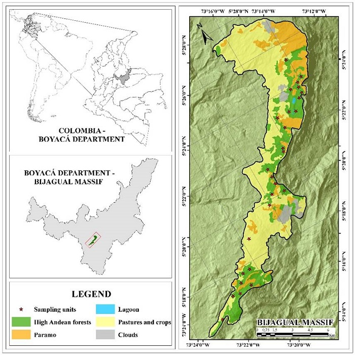 The Bijagual Massif is located in the department of Boyacá, Colombia, at the coordinates 5°26'10.28"-5°15'40.21"N and 73°13'5.20"-73°21'58.19"W, with an area of extension of 8604 ha (Gil-Leguizamón et al., 2020). Its limits are the Tota lake to the north and the Mamapacha Massif to the south (Tota-Bijagual-Mamapacha complex; Morales et al., 2007). The high Andean forest distribution (2682-3268 m a.s.l.) abuts paramo flora at the highest altitudes (2990-3460 m a.s.l.). Currently, Bijagual is not a protected natural area. There are excessive activities of inappropriate soil use with more than 50% committed to farming and cattle (Fig. 1; Gil, 2016).