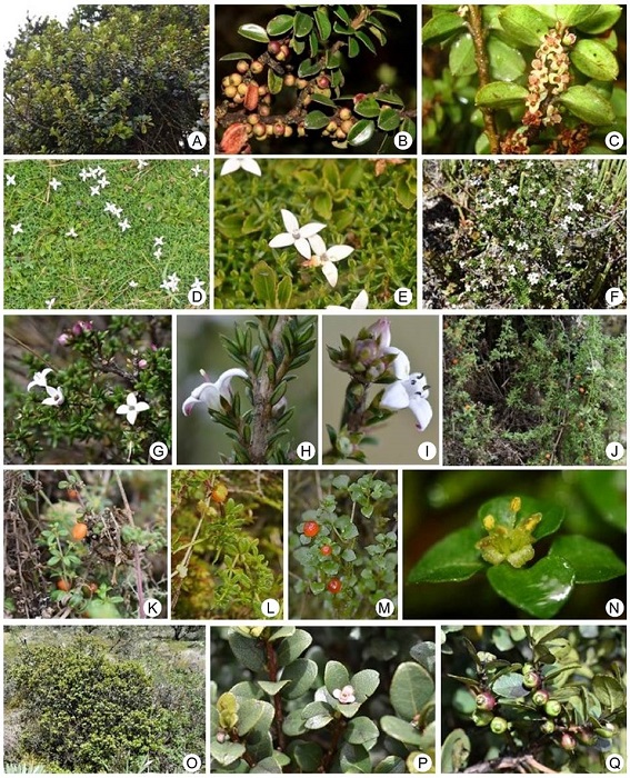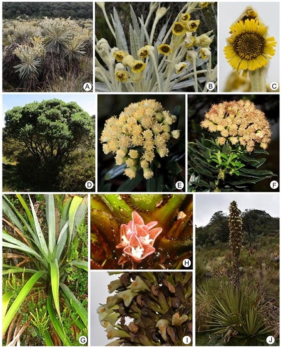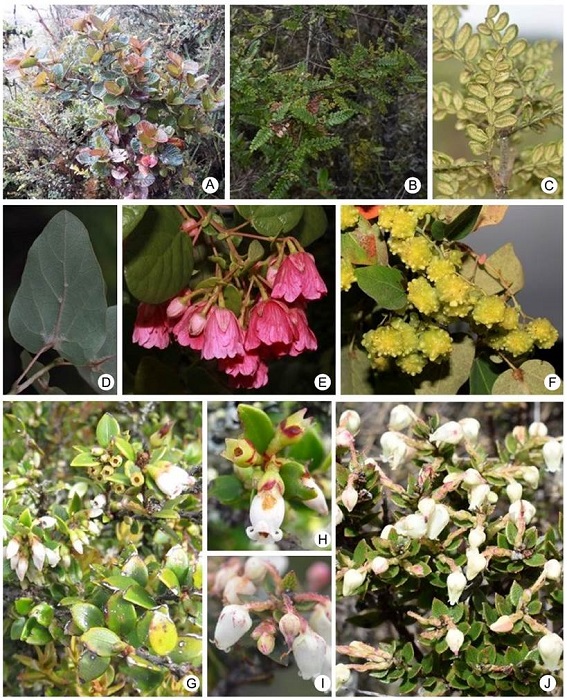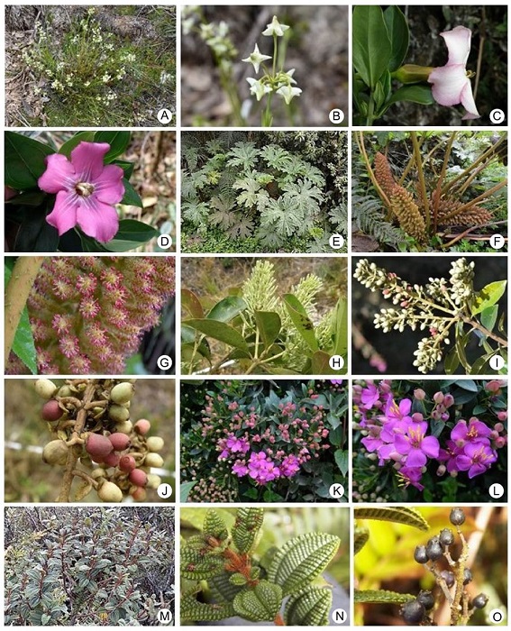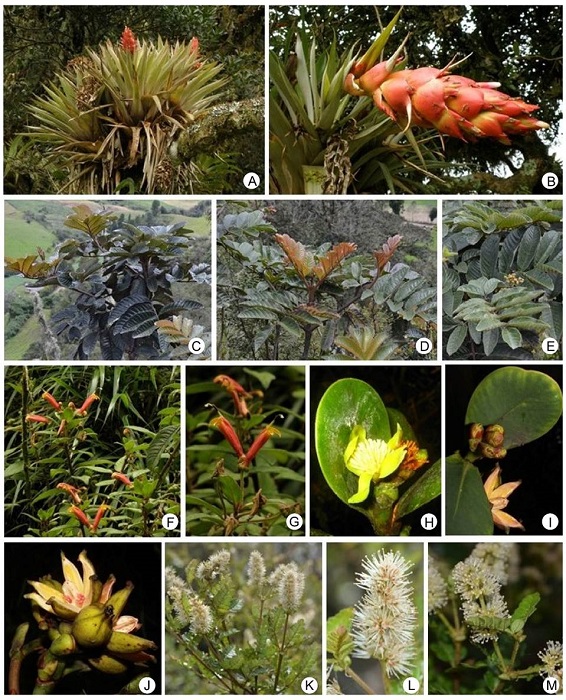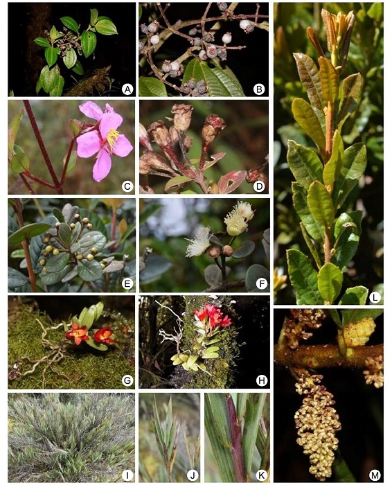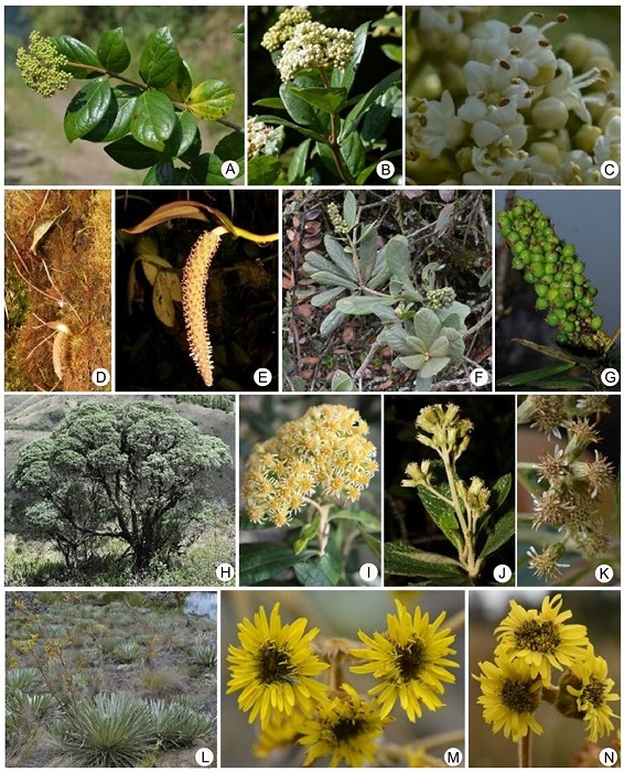 Genera such as Miconia, Pentacalia, Epidendrum, Elaphoglossum Schott ex J. Sm., Tillandsia, Ageratina, Diplostephium, Weinmannia L., Stelis, and Hymenophyllum Sm. are representative in Bijagual and they are diverse (Table). These are recorded by Cuatrecasas (1958), Marín and Betancur (1997), Franco-R. and Betancur (1999), Fernández-A. and Hernández-S. (2007), Montenegro and Vargas (2008), Álvaro-Fajardo et al. (2013) and Jadán et al. (2017), for Colombian and Ecuadorian high mountain formations. Likewise, the abovementioned authors included Brunellia Ruiz & Pav. (Figs. 4C-E), Clusia L. (Figs. 4H-J), Drimys J.R. Forst. & G. Forst., Oreopanax Decne. & Planch., Geissanthus Hook. f., Palicourea Aubl., Piper L., Escallonia Mutis ex L. f., Symplocos Jacq. (Figs. 9O-Q), Hesperomeles Lindl., Clethra L., Ilex L., and Ocotea Aubl., which are also recorded with low species richness in this research (Figs. 2, 3, 4, 5, 6, 7, 8, 9).