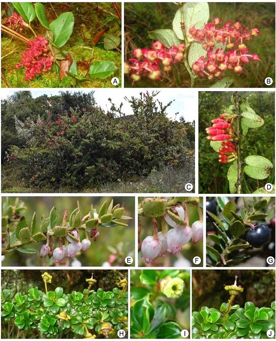 Between the altitudes of 2900-3000 (-3200) m, the families Ericaceae and Primulaceae (Myrsine L. and Geissanthus), as well as the genera Oreopanax, Weinmannia, Hedyosmum Sw., Viburnum L., Vallea Mutis ex L. f., Clusia, Gaiadendron G. Don, Myrica L., Piper, Hesperomeles, Palicourea, and Muehlenbeckia Meisn. are recorded (Gentry, 2001; Galindo et al., 2003; Olaya-Angarita et al., 2019; and Gil-Leguizamón et al., 2020). Similarly, some genera recorded in high Andean forest include species that are typical of the forest-paramo transitions in Bijagual, such as Gaiadendrum punctatum (Ruíz & Pav.) G. Don. (Figs. 7H-J), Hesperomeles obtusifolia (Pers.) Lindl., Weinmannia fagaroides (Figs. 4K-M) and W. balbisiana.