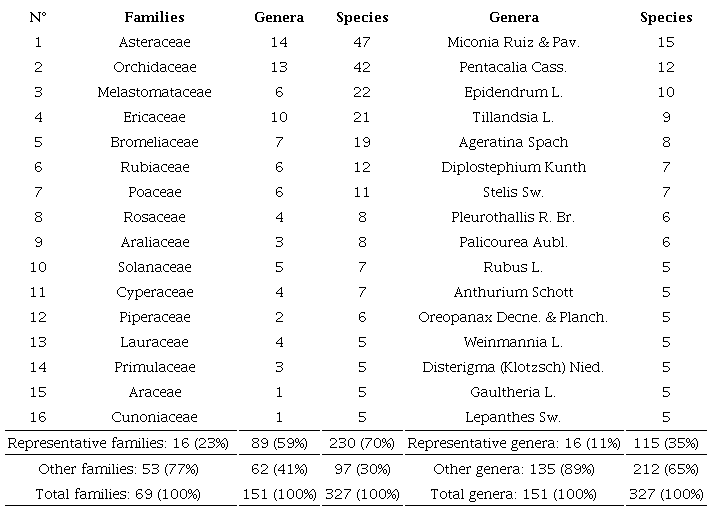 We recorded 327 species, distributed in 151 genera and 69 families (Appendix; Figs. 2, 3, 4, 5, 6, 7, 8, 9 show some of these species). The families with the highest species richness (16 families or 23%) are: Asteraceae, Orchidaceae, Melastomataceae, Ericaceae, Bromeliaceae, Rubiaceae, Poaceae, Rosaceae and Araliaceae. These contained 59% of the genera and 70% of the species (Table). The most diverse genera are (16 or 11%) Miconia Ruiz & Pav., Pentacalia Cass., Epidendrum L., Tillandsia L., Ageratina Spach, Diplostephium Kunth, Stelis Sw., Pleurothallis R. Br., Rubus L., and represent 35% of the total number of species (Table).