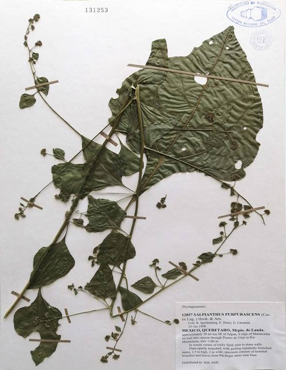 Salpianthus standleyi Steyerm., Publ. Field Mus. Nat. Hist., Bot. Ser. 22: 139. 1940. TIPO: MÉXICO. Guerrero, municipio Arcelia, Temisco, Barranca del Consuelo, above stream in open, Sierra Madre del Sur, north of Rio Balsas, Distrito Aldama, 11.XI.1937, Y. Mexia 8783 (holotipo: F-955142!; isotipos: B-100248348!, CAS-0004373!, G-00037457!; K-000572687!, MO-468945!, NY00342139!, S-0713106!, U-0005260!, UC-645120!, US-00103082).