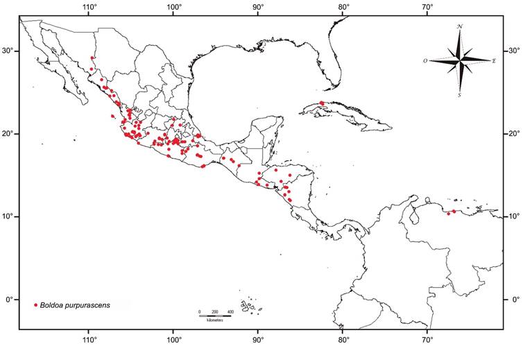 A diferencia de otros miembros de Nyctaginaceae -en particular de la tribu Nyctagineae, que incluye un gran número de especies xerófitas distribuidas en las regiones áridas de Norteamérica, con una gran diversidad en México-, la tribu Boldoeae se encuentra principalmente en los estados de la costa del Pacífico del país. Además, presenta afinidad ecológica a zonas cálidas, mayormente en el bosque tropical caducifolio (BTC), seguido por su distribución en bosque tropical subcaducifolio (BTS) y bosque espinoso (BE); siendo este patrón más evidente en Salpianthus. Al parecer la humedad es un factor importante para el establecimiento de las especies de la tribu, ya que el BTC se caracteriza por un grado de humedad intermedio entre el BTS y BE, que presentan mayor y menor humedad, respectivamente. Por otro lado, no es raro encontrar a las especies en áreas perturbadas y en tipos de comunidades secundarias derivadas de estos bosques ya que, por lo menos en el BTC tres cuartas partes de su superficie se encuentran hoy convertidas en comunidades secundarias, así como en parcelas agrícolas, hortícolas y potreros (Rzedowski y Calderón de Rzedowski, 2013). Si bien Boldoa purpurascens llega a extenderse en México a algunos estados del centro y sur sureste, específicamente en Veracruz, es clara su ausencia en el noreste y en las penínsulas de Baja California y Yucatán; esta última también con una cubierta vegetal importante de BTC.