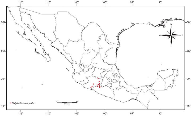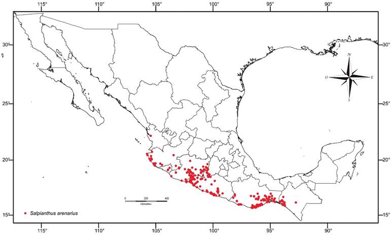 Ejemplares examinados: MÉXICO. Chiapas, municipio Arriaga, 13 km north of Arriaga along Mexican highway 195, 830 m, tropical deciduous forest, 15.I.1972, D. E. Breedlove y E. McClintock 23733 (MEXU); along stream 6 km north of Arriaga, 250 m, slope with tropical deciduos forest, 05.III.1972, D. E. Breedlove 24426 (MEXU); along road between Arriaga and Zapanatepec at the boder between Oaxaca and Chiapas, 150 m, dry slope, thorn Woodland, 26.IV.1972, D. E. Breedlove 24841 (MEXU); along ravines 13 km north of Arriaga along Mexican highway no. 195, 830 m, 23.XII.1972, D. E. Breedlove 30550 (ENCB, IEB, MEXU); ejido Las Nubes, 250 m, selva baja caducifolia, 27.XI.2002, R. Cruz D. y A. Reyes 5586 (MEXU); cerro Monte Bonito, 1 km al SE de Col. Alianza 550 m, selva mediana, 29.XI.2002, R. Cruz y A. Reyes 5658 (MEXU); ejido 5 de febrero, 297 m, selva baja caducifolio, 01.XII.2002, A. Reyes-García y D. Gómez 5727 (MEXU). Municipio Cintalapa, 23 km west of Las Cruces along road to La Mina Microwave Station, 870 m, ridge with Pinus and Quercus, 14.IX.1981, D. E. Breedlove 52760 (ENCB). Municipio Tonalá, puerto Arista, 3 m, extensive sand dunes, 31.X.1981, D. E. Breedlove y G. Davidse 54194 (ENCB); Paderon, 17.IX.1947, E. Matuda 16934 (MEXU); Mojarra, 27.XI.1947, E. Matuda 17161 (MEXU); ejido Costa Rica, 420 m, selva baja caducifolia, 16.III.2002, E. Meléndez et al. 26 (MEXU); en las cercanías de la zona arqueológica Iglesia Vieja, 750 m, vegetación selva baja, 27.X.2002, A. Reyes-García et al. 5619 (MEXU); El Quetzal, 8 km al sur de Tonalá, 50 m, matorral, 04.III.1988, E. Ventura 5113 (IEB, MEXU); rancho La Gloria, al E de Tonalá, 2000 m, 20.I.1983, S. Zamudio 579 (IEB); rancho La Gloria, al E de Tonalá, potrero, 20.I.1983, S. Zamudio 580 (MEXU). Colima, municipio Colima, Tecomán, Tecolapa, entre Limoneros, 21.XII.1985, J. Maillet 55 (MEXU); crucero de Tepames - Piscila, cerca del río Salado, 350 m, selva baja caducifolia, 13.II.1995, M. Navarrete de la Paz 769 (MEXU). Estado de México, municipio Otzoloapan, La Junta, cerca de Tingambato, 550 m, matorral seco, 20.XII.1953, E. Matuda 29801 (MEXU). Municipio Tejupilco, El Palmar Chico, 2450 m, selva baja subcaducifolia, 18.I.1972, F. González-Medrano et al. 4013 (MEXU); 1 km al NO del rancho El Naranjo, 900 m, selva baja caducifolia, 27.XII.1972, F. González-Medrano et al. 4998 (ENCB, MEXU); 10 km al NE de Nanchititla, entre Los Bancos y Piedra Grande, 1950 m, bosque mesófilo, 10.IV.1973, F. González-Medrano et al. 5598-BIS (MEXU); desviación El Campo - Nanchititla, 1400 m, selva baja caducifolia en perturbación, 27.X.1978, E. Guízar 267 (ENCB); rivera del Río el Salto, S de Nanchititla, 780 m, bosque en galería, 09.IV.1992, C. Zepeda-Gómez 69 (MEXU). Municipio Tlatlaya, 25 km al S de Amatepec, terracería Amatepec - Arcelia, 1195, selva baja caducifolia primaria en cañada, 05.V.1988, G. Flores-Franco y L. Terpán 749 (MEXU); San Antonio, Tlatlaya, 220 m, matorral bajo claro, 25.I.1953, E. Matuda 28009 (MEXU), 28011 (MEXU); C. de San Antonio, Tlatlaya, 500-700 m, bosque bajo, espinoso, deciduo, 29-30.XI.1954, E. Matuda 32094 (MEXU); carretera de Tejupilco a Amatepec y la presa Vicente Guerrero, poco al N de la Presa, aprox. 300 m antes de El Ancón, 550 m, milpas cosechadas en los dos lados de la carretera, 08.XII.1996, H. Vibrans 6479 (MEXU). Guerrero, municipio Acapulco de Juárez, above Playa Hornos, east of Acapulco, 03.I.1944, F. A. Barkley 14160 (MEXU); Parque Recreativo Papagayo sobre la Av. Miguel Alemán, relictos selva mediana subcaducifolia, 27.III.1992, J. I. Calzada y J. L. V. Salinas 17666 (MEXU); Los Amates, orilla de la laguna de Tres Palos, 15 m, acahual, 14.XI.1987, N. Diego 4674 (MEXU); 0.5 km del camino principal de la carr. Ixtapa - Zihuatanejo, en la brecha al cerro de piedra, 18.V.1977, M. T. Germán et al. 293 (MEXU); vicinity of Tres Palos lagoon, just east of Acapulco, sea level, along sandy roadside, 23.XI.1975, A. Lasseigne 4964 (ENCB, MEXU); Puerto Marqués, colecta a lo largo del camino al W, por las residencias, 22.V.1979, W. López-Forment 782 (MEXU); 4 km al N Las Cruces, 29.IV.1979, W. López-Forment 882 (ENCB, MEXU); viveros El Huayacán, la Poza, 29.X.1979, W. López-Forment 984 (ENCB, MEXU); 1 km al N Puerto Marqués, 30.XII.1980, W. López-Forment 1250 (MEXU); Parque Nacional El Veladero, col. Primero de Mayo, 250 m, 14.XI.1984, N. Noriega 326 (IEB); sin localidad, 01.XII.1952, L. Paray 385 (ENCB); sin localidad, 01.V.1905, Paray 4758 (MEXU); en Llano Largo, 3 km al SE de Puerto Marquéz, 10 m, secundaria de selva mediana caducifolia, 28.V.1986, J. C. Soto-Núñez y F. Solórzano 12858 (MEXU); aprox. 4 km al NE de El Crustel y 19 km al NE de Arcelia, carr. Cd. Altamirano - Iguala, 1076 m, selva baja caducifolia perturbada, 04.V.2014, J. C. Soto-Núñez 21319 (MEXU); La Venta, 50 m, 08.XI.1967, F. A. Villanueva s.n. (ENCB); Copacabana, 22.XII.1966, L. Wolfgang-Boege 469 (MEXU). Municipio Ajuchitlán del Progreso, cerro La Parotita de San Antonio de los Libres, 356 m, 01.XI.2014, P. Chamú-Alonso 317 (IEB). Municipio Atoyac de Álvarez, 25.XI.1966, G. S. Ordetx s.n. (ENCB, MEXU); Laguna de Mitla, 0 m, manglar, 24.III.1984, L. Lozada-Pérez 188 (ENCB). Municipio Ayutla de los Libres, Roca Colorada, 600-800 m, selva baja caducifolia y selva mediana subperennifolia, 16.IV.1998, M. A. Álvarez-Lugo 155 (MEXU). Municipio Benito Juárez, embarcadero de El Dorado II, laguna de Mitla, 0 m, manglar, 05.III.1985, M. Goreti-Campos 1599 (MEXU); El Dorado II, Laguna de Mitla, 3 m, cultivo, 03.III.1985, L. Lozada-Pérez 313 (ENCB, MEXU). Municipio Chilpancingo de los Bravo, carretera Chilpancingo a Palo Blanco, 1160 m, sabana, 19.VII.2000, U. González-Quintero 2184 (MEXU); Rincón de La Vía, 700 m, 06.XII.1959, H. Kruse 119 (ENCB, IEB, MEXU); 3 km antes de Agua de Obispo, 650 m, bosque tropical caducifolio, A. Peláez s.n. (MEXU); 16 km al N de Ocotito, carr. Tierra Colorada - Chilpancingo, 877 m, selva